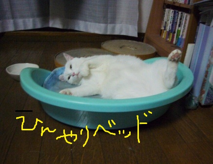 白猫様が、ひんやりベッドの上にっ!!