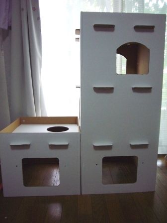 内容は三階建て1箱+一階建て2箱のセット。「キャットキャッスルねこ三銃士」と同じものですが、表面はイラストなしの白い箱です。