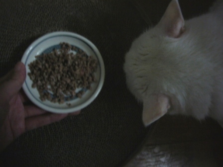 白猫様に健康で長生きしていただくために、なんとしても、ウェットフードの処方食を召し上がっていただきます!
