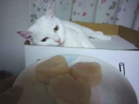 先代白猫のちいこは、大好物だったよ、ホタテの貝柱。絶対おいしいから、食べてみ!