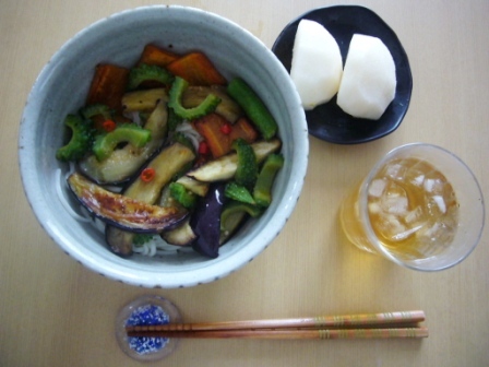 そんな騒ぎもありつつ収穫したゴーヤーと鷹の爪は、昨日の残りの冷や麦の上にのせられて、朝ごはんとなりました。