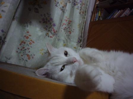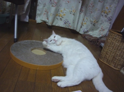 箱には飛び込む、板状のものには噛み付く・爪を研ぐ、寝そべる。